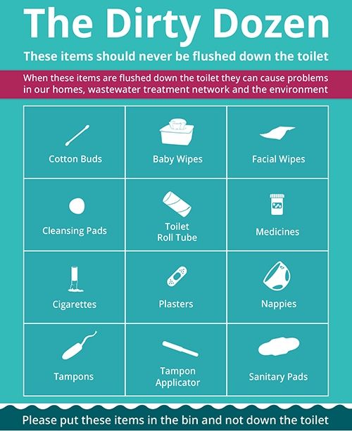Nuair a sruthlaítear na rudai seo síos an leithreas, cruthaíonn sé an-chuid fadbhanna inár gcuid tithe, ár lionra fuíolluisce agus ár thimpeallacht mhuirí. Cuir sa bhosca bruscair iad, in ionad an leithreas.