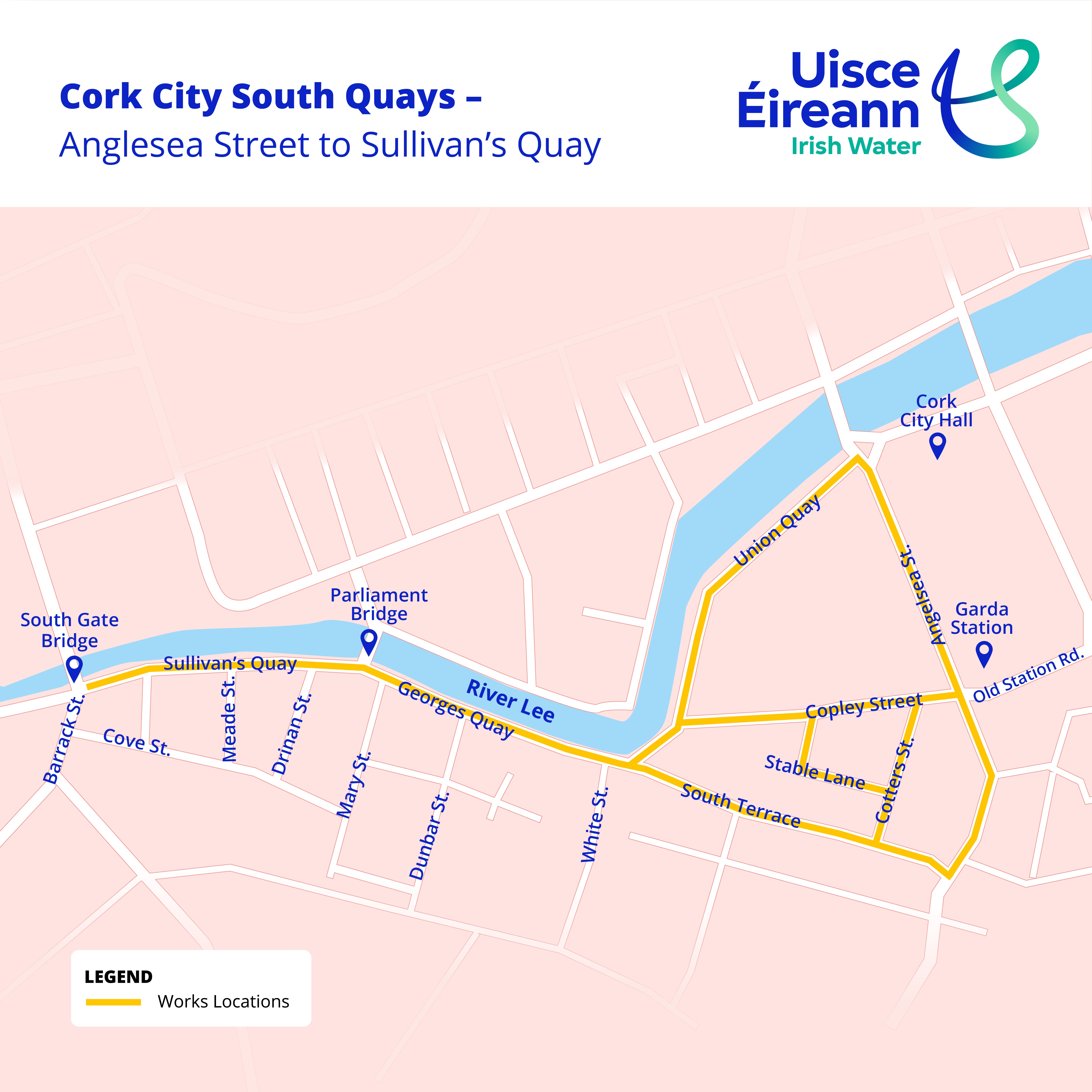The works, being carried out by Ward and Burke Construction Ltd on behalf of Uisce Éireann, will take place between Anglesea Street and Sullivan's Quay, including Union Quay, Copley Street, Cotters Street, Stable Lane, South Terrace, and George's Quay. Works will commence next week at South Terrace and will be carried out in phases with some road closures required. Residents and businesses will be engaged with directly in advance of traffic management moving through each phase. Local and emergency traffic will always be maintained.