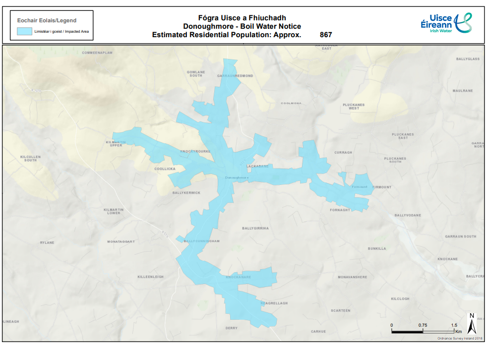 The population impacted by this notice is approximately 867 people. This notice was issued, in consultation with the HSE, due to a process issue at Donoughmore Water Treatment Plant which compromised the disinfection of the water supply. The areas potentially affected include customers in Donoughmore, Firmount, Lackabane, Ballycunningham, Knockanare, Kilmartin Upper, Garraunredmond and surrounding areas.