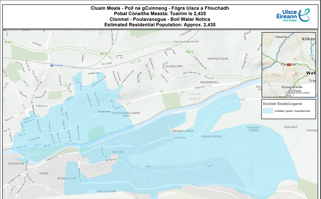All customers on the Clonmel Poulavanogue Public Water Supply Scheme are affected. Customers can check if their property is included by visiting the Water Quality section of www.water.ie and entering the property's Eircode or by calling the Uisce Éireann's customer care helpline, open 24/7, on 1800 278 278. A map of the area is attached and available to view on the supply and service section of water.ie.