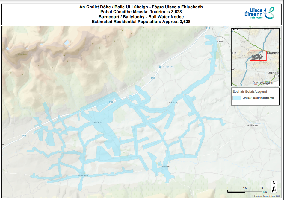The notice was put in place to protect the health of approximately 3,620 customers supplied by Burncourt Regional and Burncourt Ballylooby public water supplies in Burncourt, Ballyporeen, Clogheen, Ballylooby, Mitchelstown Road in Cahir, and surrounding areas as well as customers on the Kiltankin and Clonmore South group water schemes.