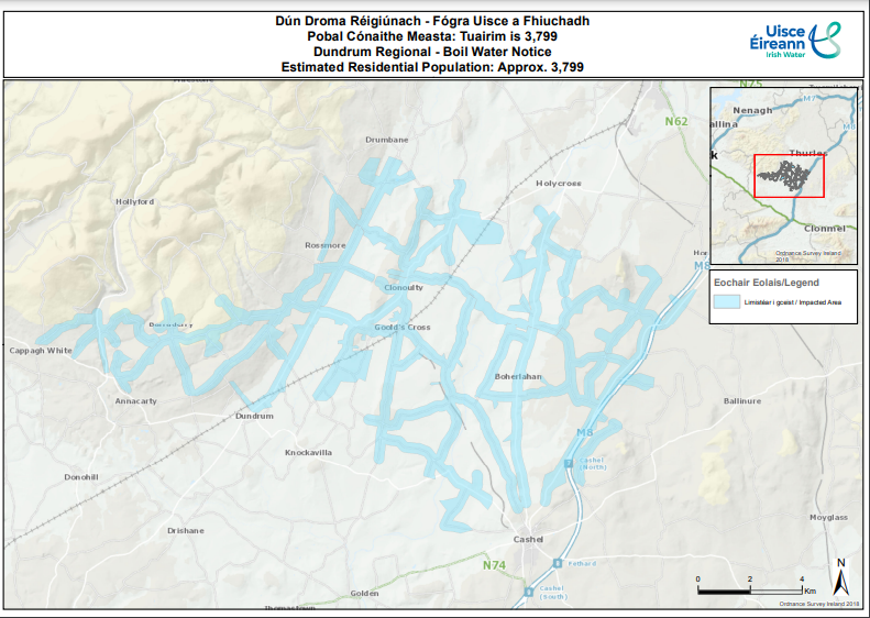 The notice impacts all customers supplied by the Dundrum Regional Public Water Supply scheme including Boherlahan, Goold's Cross, Clonoulty, Barraderry and surrounding areas. Please note, Dundrum Village is not impacted by this Boil Water Notice as it is supplied by another scheme, the boundary is at the crossroads at the North East of the village; crossroads of the R505 and R661.