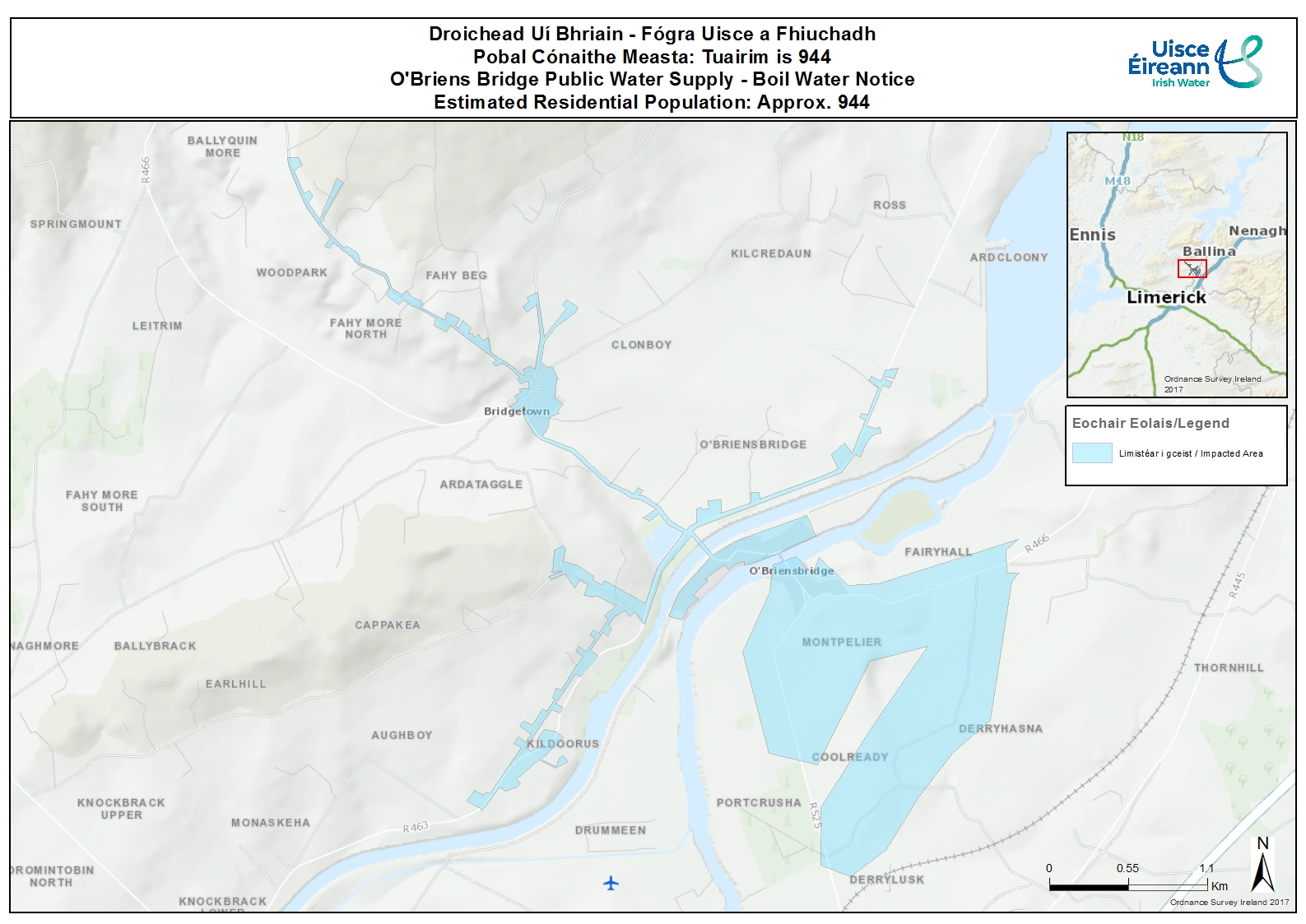 Following consultation with the Health Service Executive, Uisce Éireann and Clare County Council have issued a Boil Water Notice to protect the health of approximately 950 customers supplied by the O'Brien's Bridge Public Water Supply. This follows an issue with disinfection at the plant.