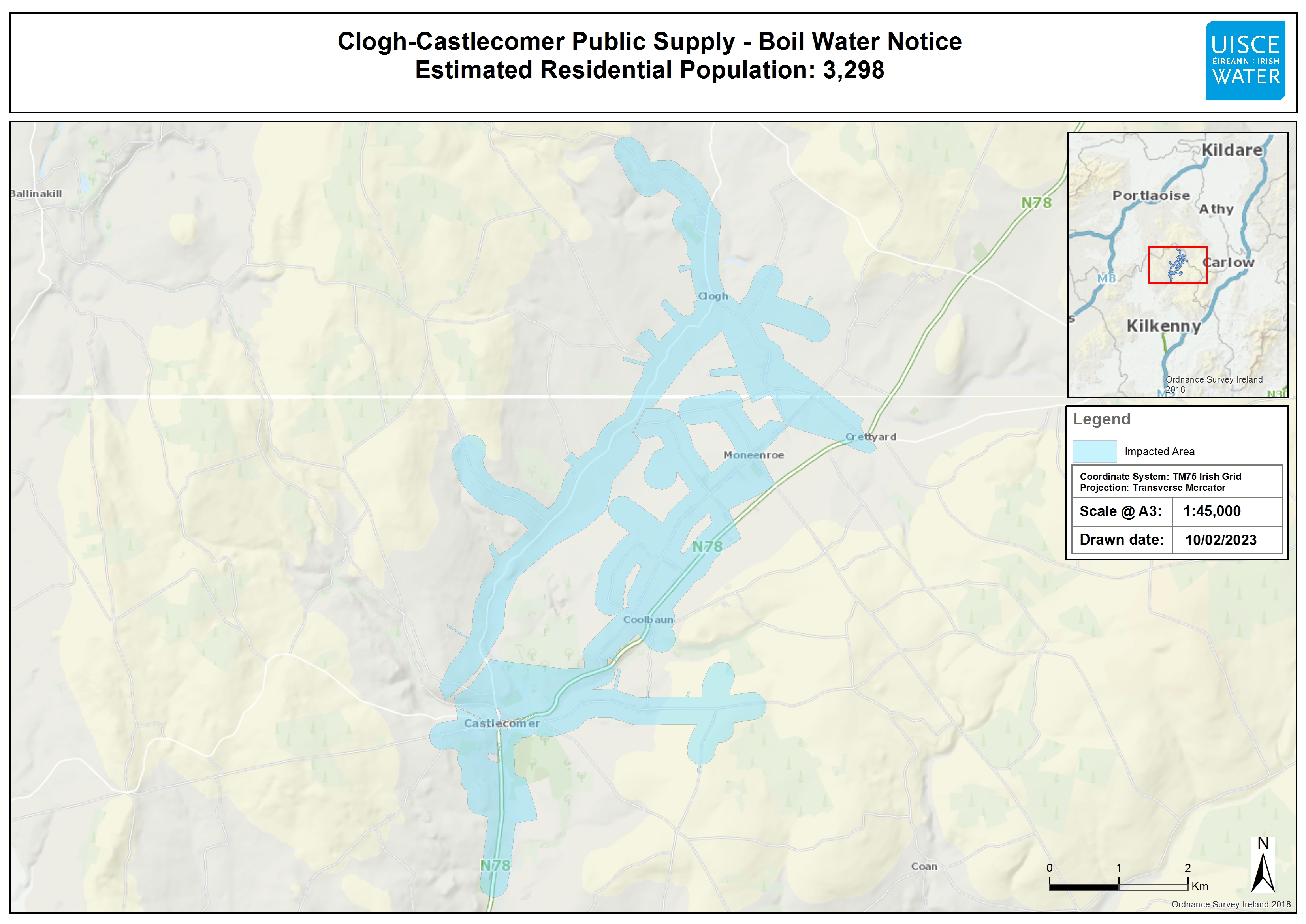 Areas impacted include Clogh, Moneenroe, Castlecomer and surrounding areas. Customers can check if their property is included by visiting the Water Quality section of our website and entering the property's Eircode or by calling the Uisce Éireann customer care helpline, open 24/7, on 1800 278 278. A map of the area is attached and available to view on the supply and service section of water.ie.