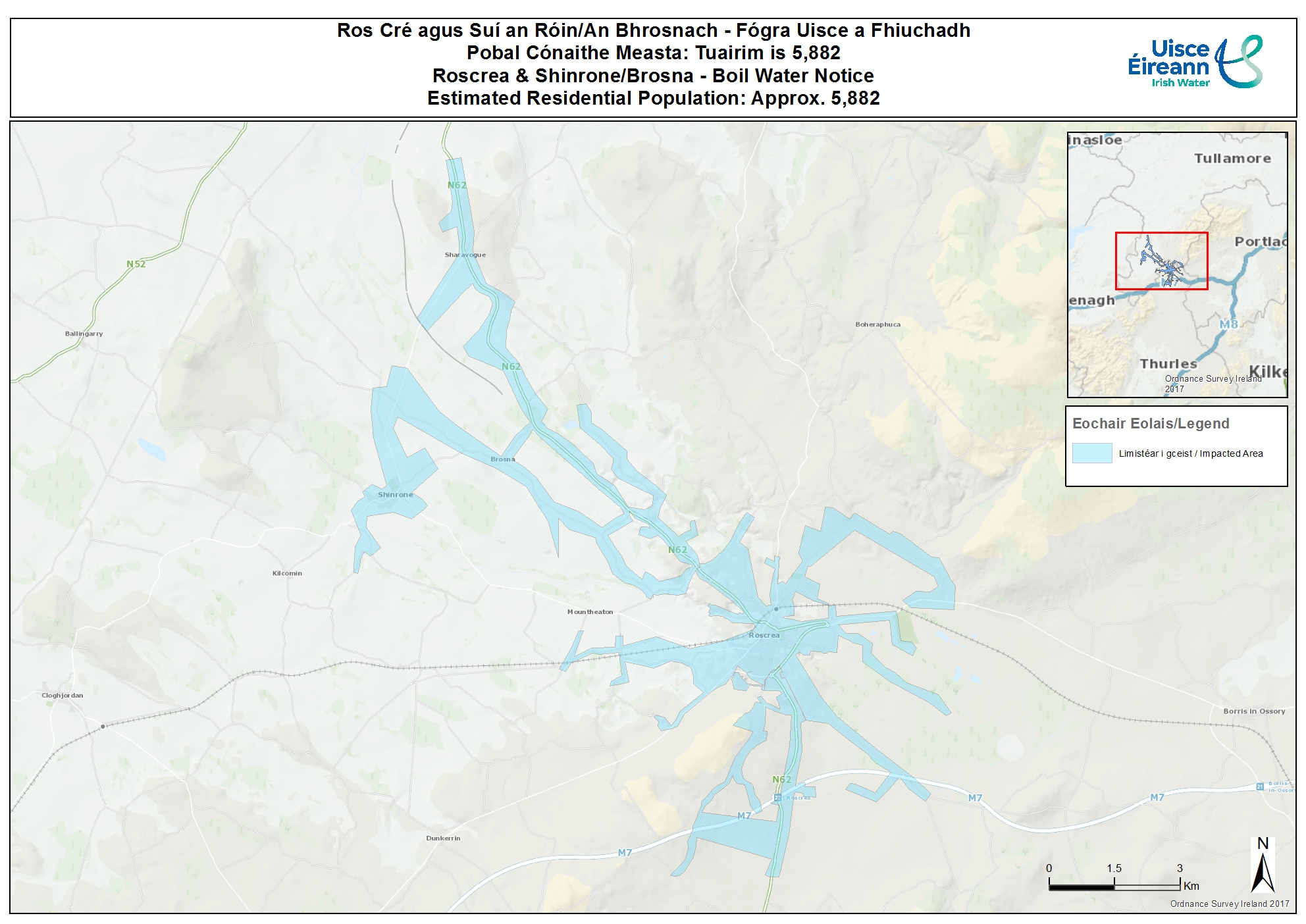 The notice impacted customers in Roscrea town and surrounds, Glenbeha, Camlin, Scart, Gortmulin, Thesheehys, Derrymore, Racket Hall, Monaincha, Pintown, Irby, Borris and surrounding areas in County Tipperary. In County Offaly, customers in Cooleeshill, Killavilla, Whitepark, Sheehane, Cloonagh, Shinrone Village, Brosna, Dungar and surrounding areas were also impacted by this Boil Water Notice.