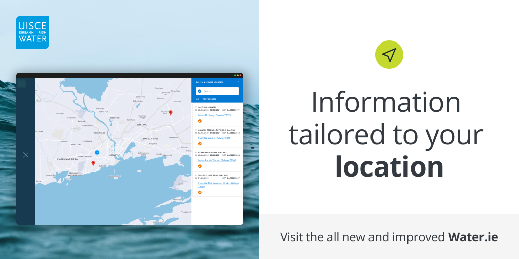 Designed to work on your mobile phone or any other device, the state of the art website lets you set your location with updates and news relevant to your locality served upfront on the homepage. It also enables Uisce Éireann to deliver important public health messages and reassurance to the public that we are working every day to provide a clean and safe supply of drinking water for our customers while returning wastewater safely to the environment.