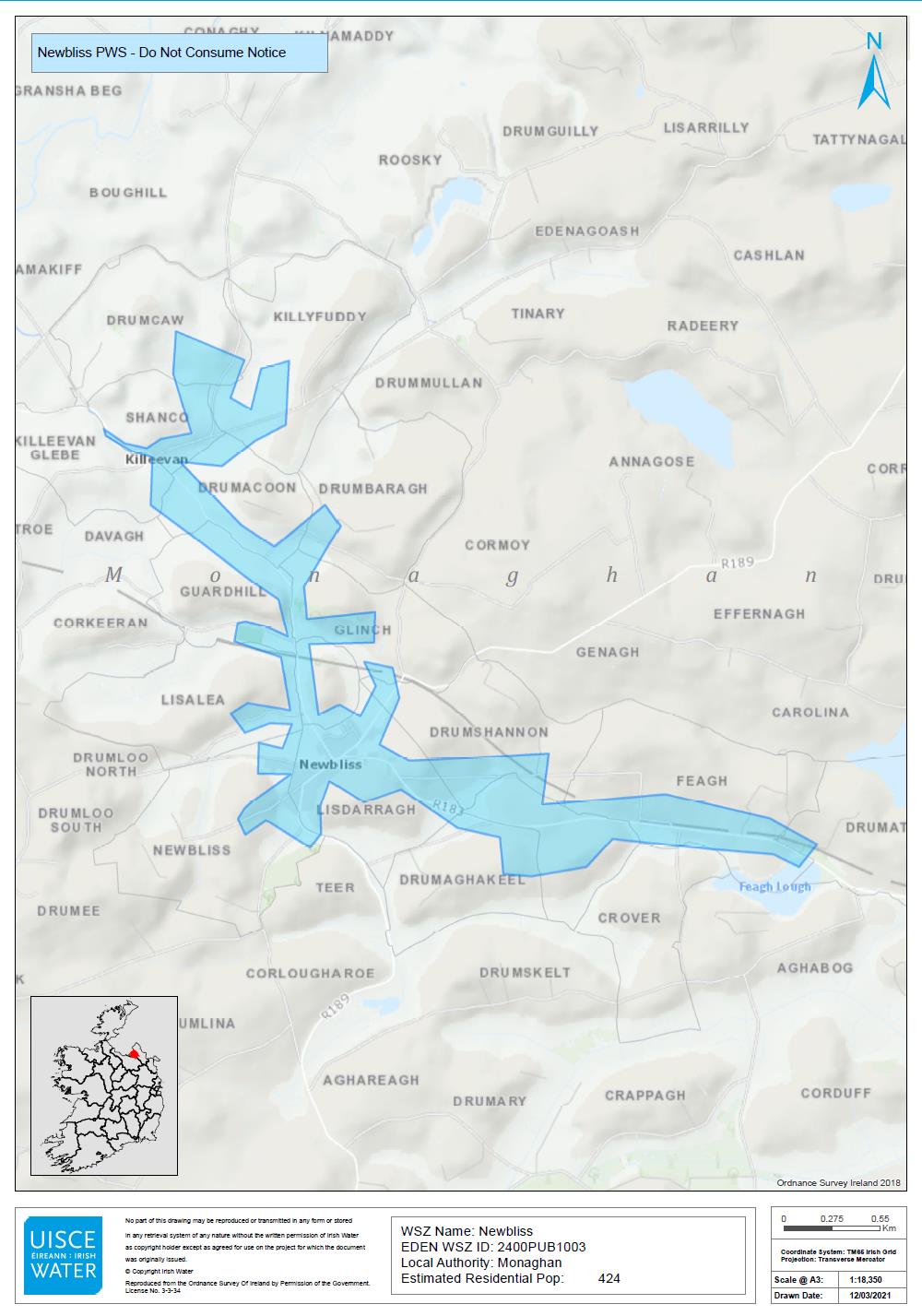 Following consultation with the Health Service Executive (HSE), Uisce Éireann and Monaghan County Council issued a Do Not Consume Notice for all consumers on the Newbliss Public Water Supply Scheme due to elevated levels of iron and manganese. The Do Not Consume Notice remains in place pending the completion of remedial works and receipt of satisfactory monitoring results. The notice applies to over 400 customers supplied by the Newbliss Public Water Supply Scheme.