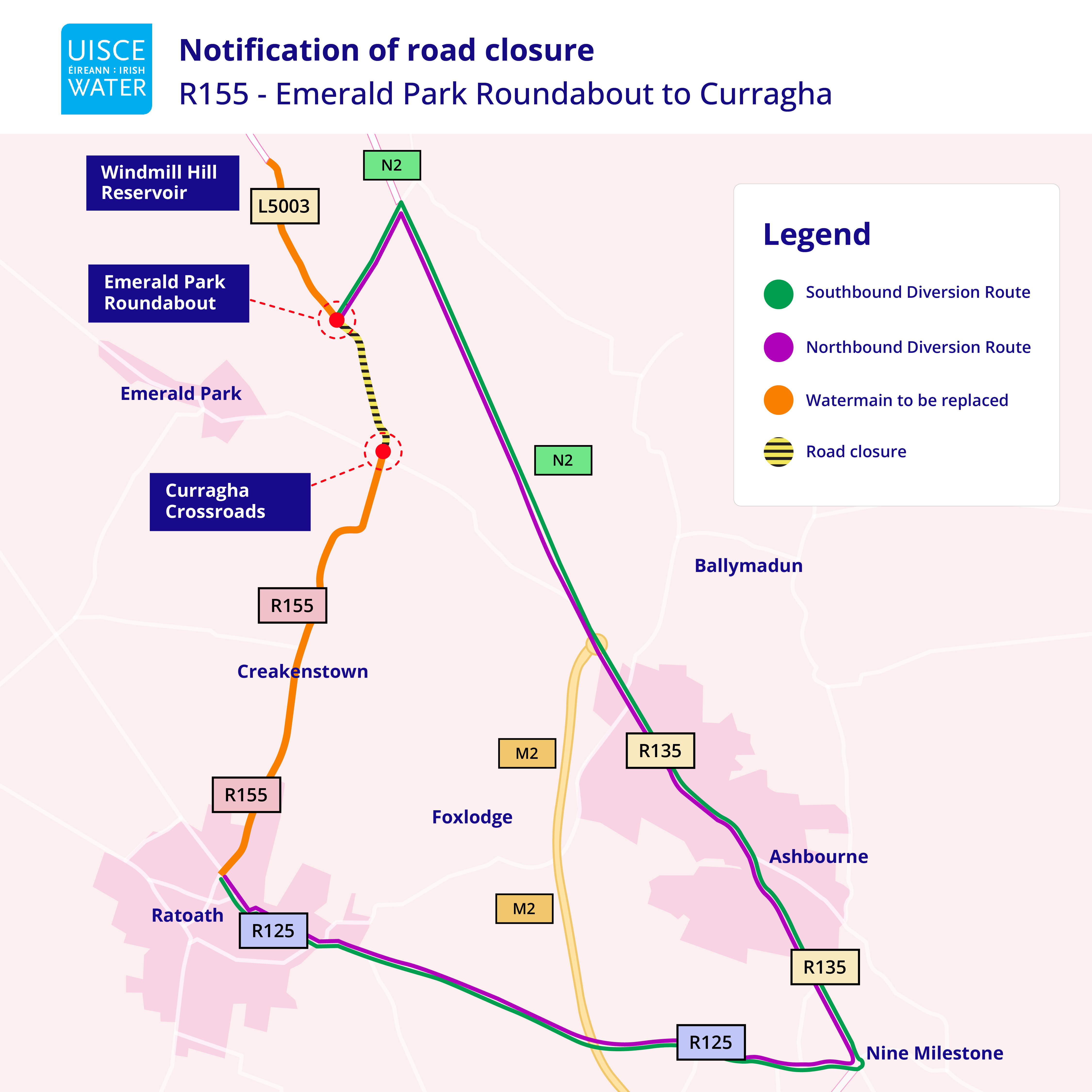 As part of the project, being delivered by Shareridge Ltd on behalf of Uisce Éireann and Meath County Council, necessary road closures will be required. Pipelaying works will initially begin at the Emerald Park Roundabout (formally Tayto Park) and then progress along the R155 towards Curragha from Monday 27 March to Monday 8 May 2023.