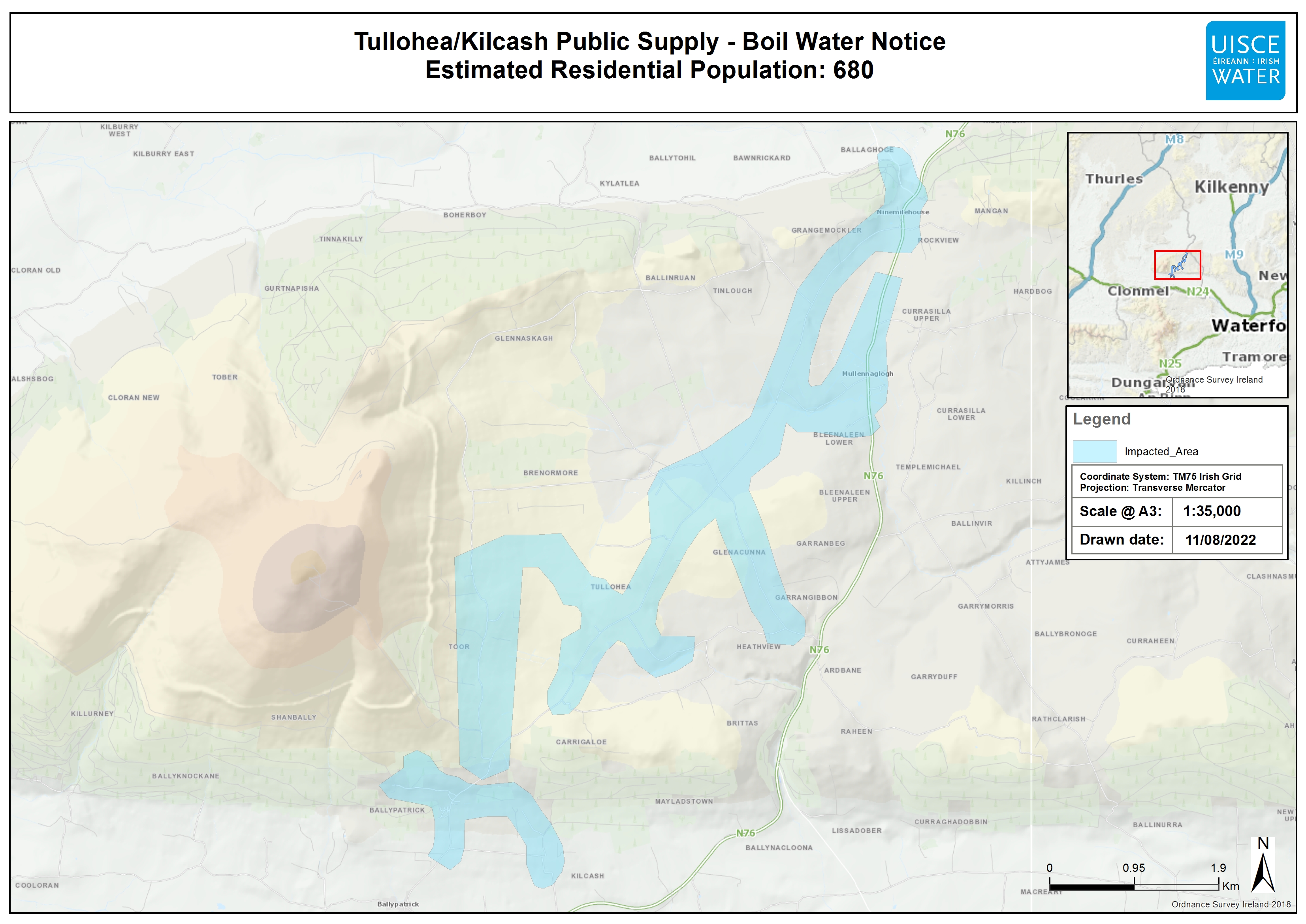 The Boil Water Notice was issued on August 11 2022 to protect the health of approximately 206 people in Kilcash and 406 in Tullohea following issues identified with the treatment process at the treatment plant.