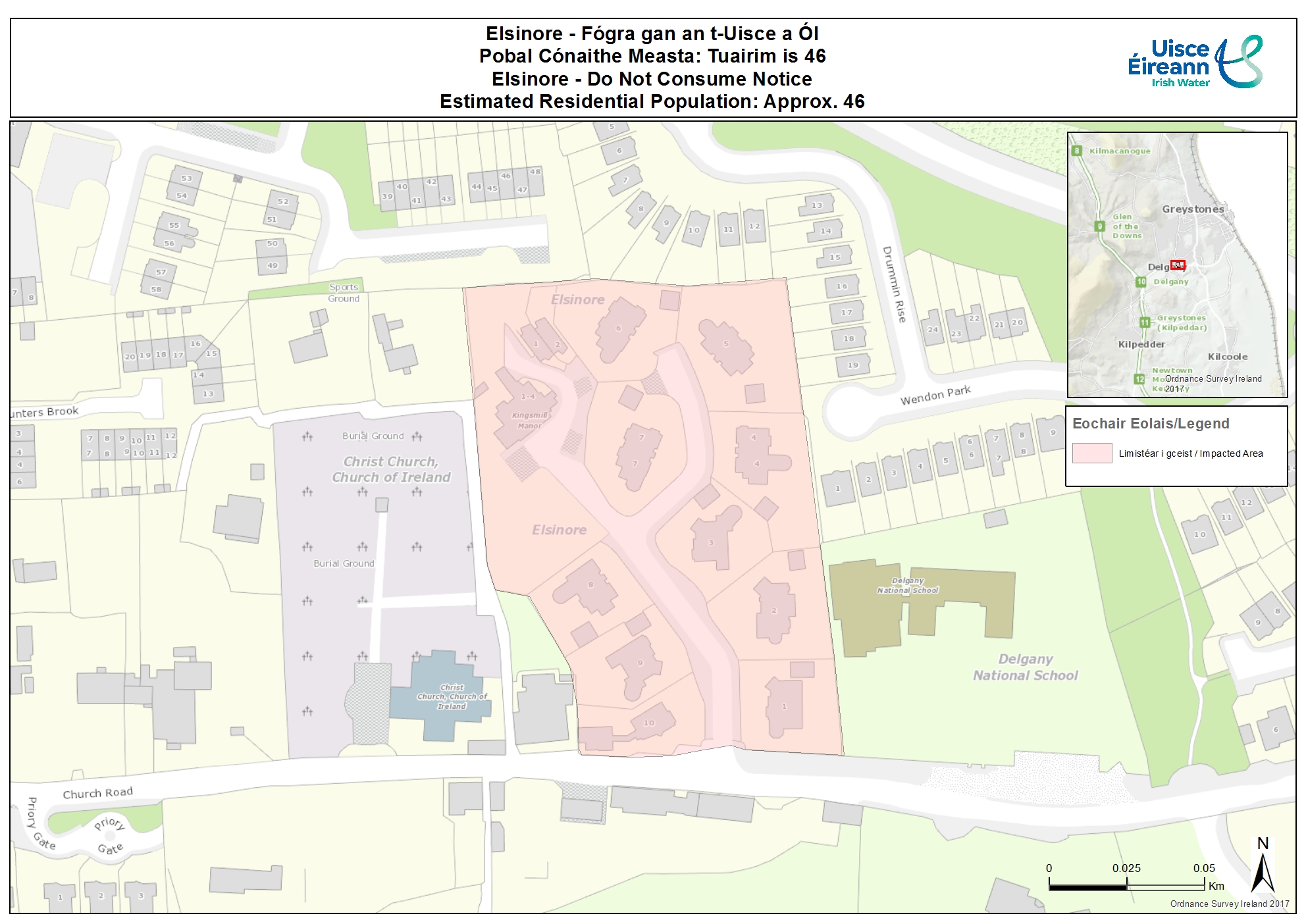Uisce Éireann and Wicklow County Council would like to remind customers that the precautionary Do Not Consume Notice issued in consultation with the Health Service Executive (HSE), remains in place for 17 properties in Elsinore in Delgany, Co. Wicklow.