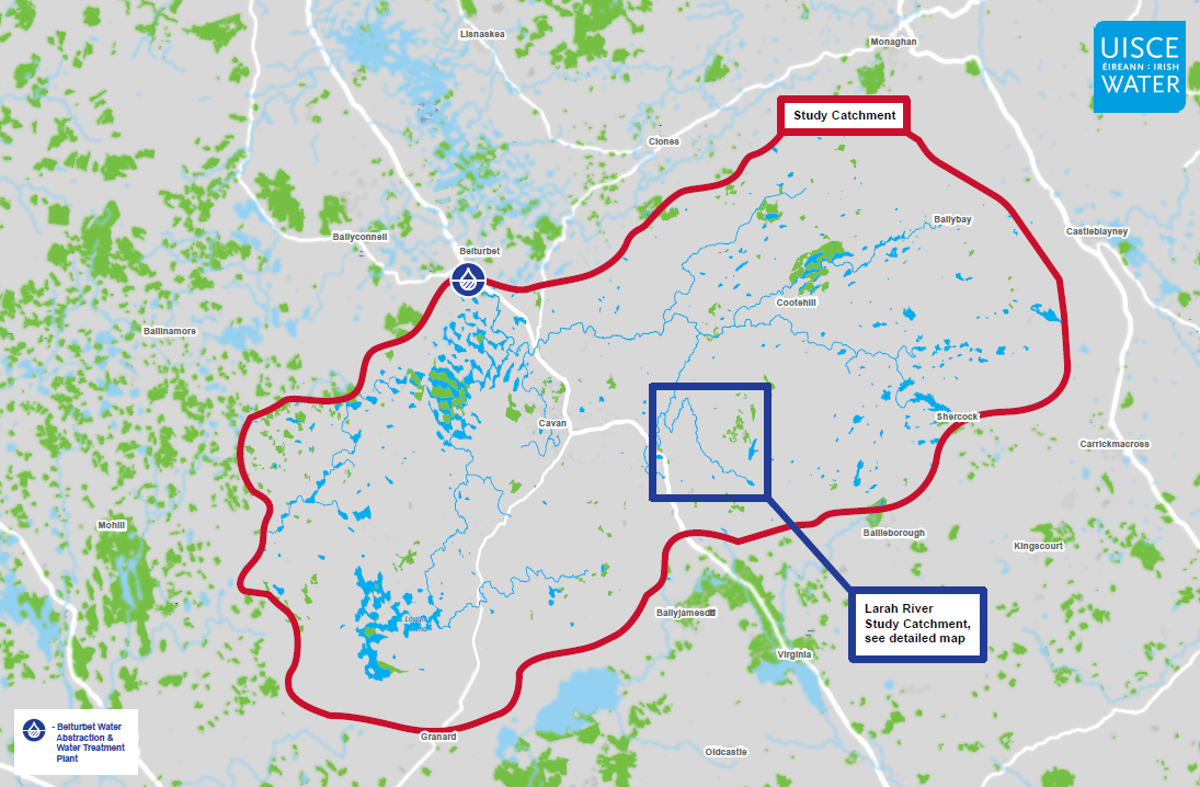 The Belturbet Public Water Supply Scheme (PWS) abstracts from the Upper Erne River near the town of Belturbet Co. Cavan. The drinking water catchment area is about 1,500 km² and the land-use is predominantly pasture (83%). The Belturbet PWS provides drinking water for Belturbet town in County Cavan and serves over 1,700 people.