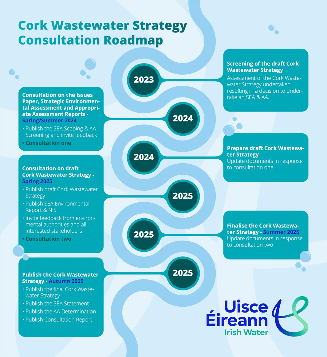 Following the conclusion of consultation 1, Uisce Éireann will review and consider feedback received from stakeholders. In 2025, the draft Cork Wastewater Strategy will be published, and an eight-week public consultation will be undertaken, before being reviewed and finalised in 2025.