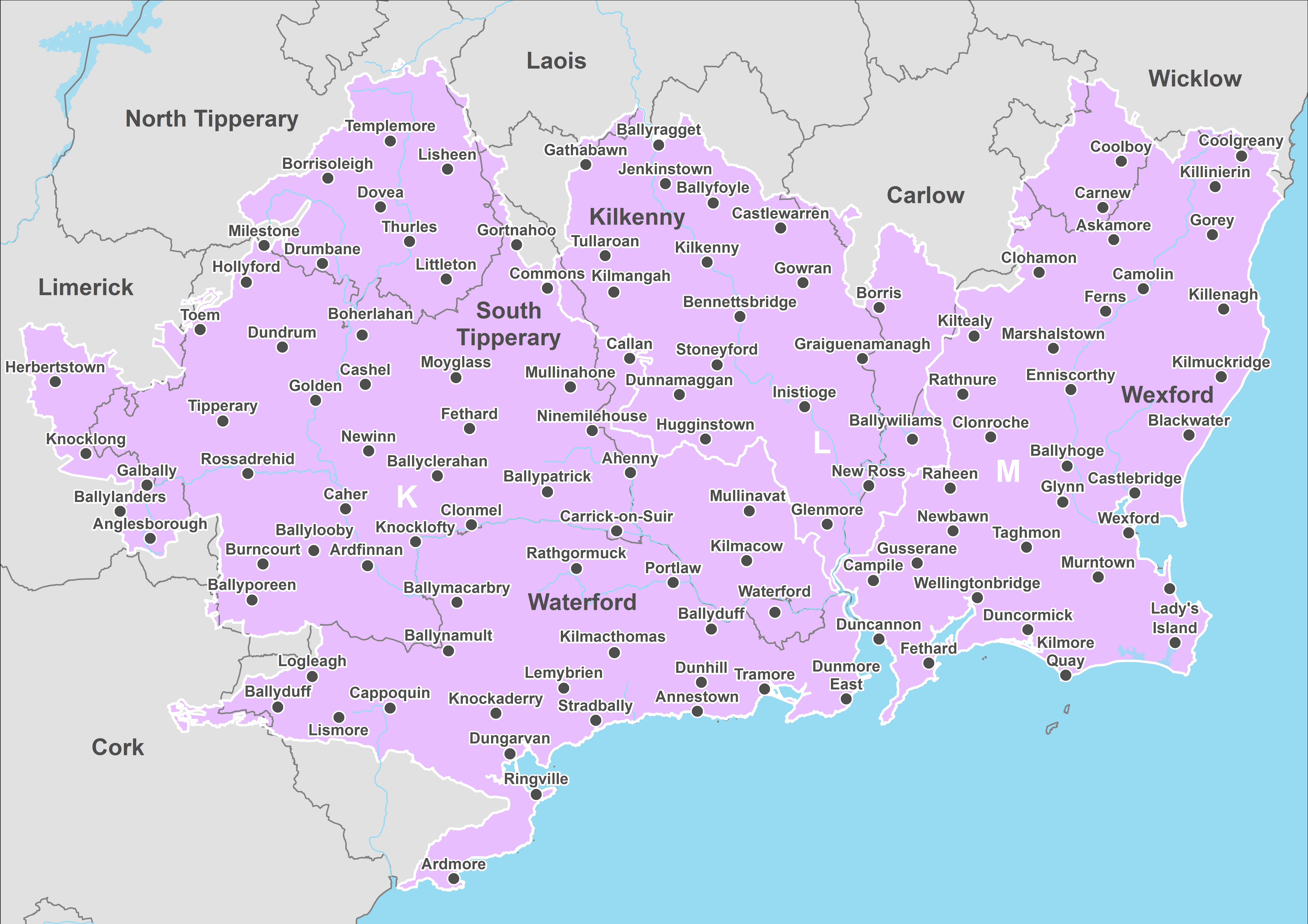 Close up of the map of Ireland zooming into Waterford, Wexford and Kilkenny labelled in K L and M